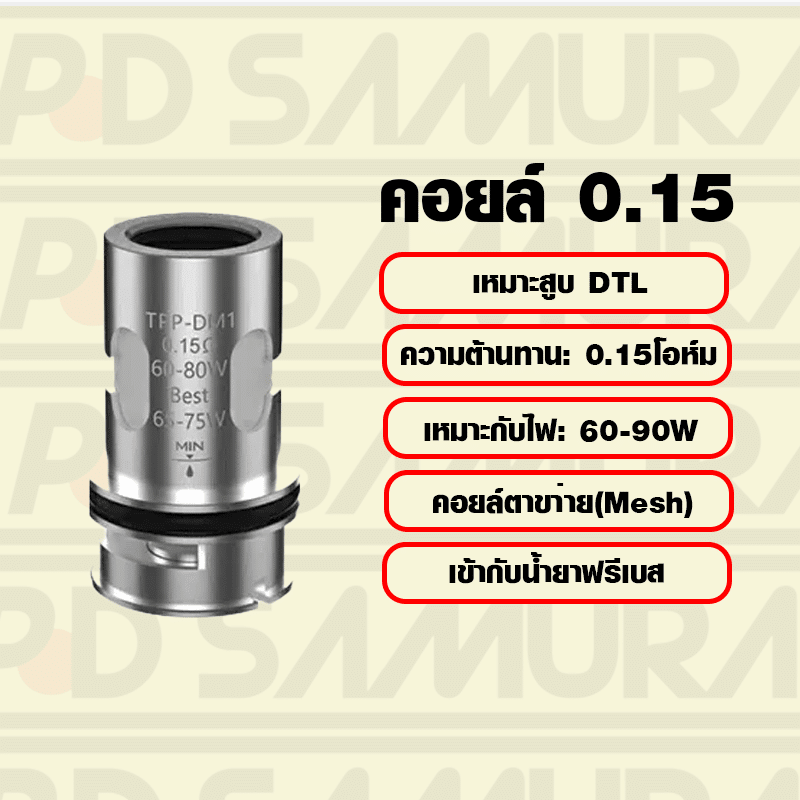 คอยล์ 0.15 โอห์ม มีการตั้งค่าวัตต์ที่แนะนำที่ดีที่สุดคือ 60-90 วัตต์ คอยล์เป็นแบบซับโอห์ม(Sub Ohm) แนะนำให้สูบแบบปากสู่ปอด (DTL)