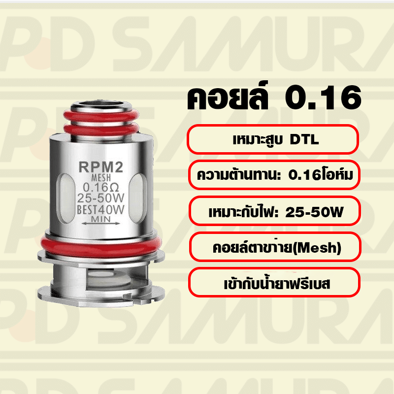 คอยล์ 0.16โอห์ม มีช่วงวัตต์ที่แนะนำคือ 25-50 วัตต์ โดยกำลังวัตต์ที่ดีที่สุดอยู่ที่ 40 วัตต์ ซึ่งหมายความว่าคอยล์เหล่านี้ได้รับการออกแบบมาสำหรับการสูบแบบ sub ohm จากปากสู่ปอด(DTL) คอยล์ 0.16 สามารถสร้างควันก้อนโตและเกิดรสชาติที่เข้มข้นขึ้น