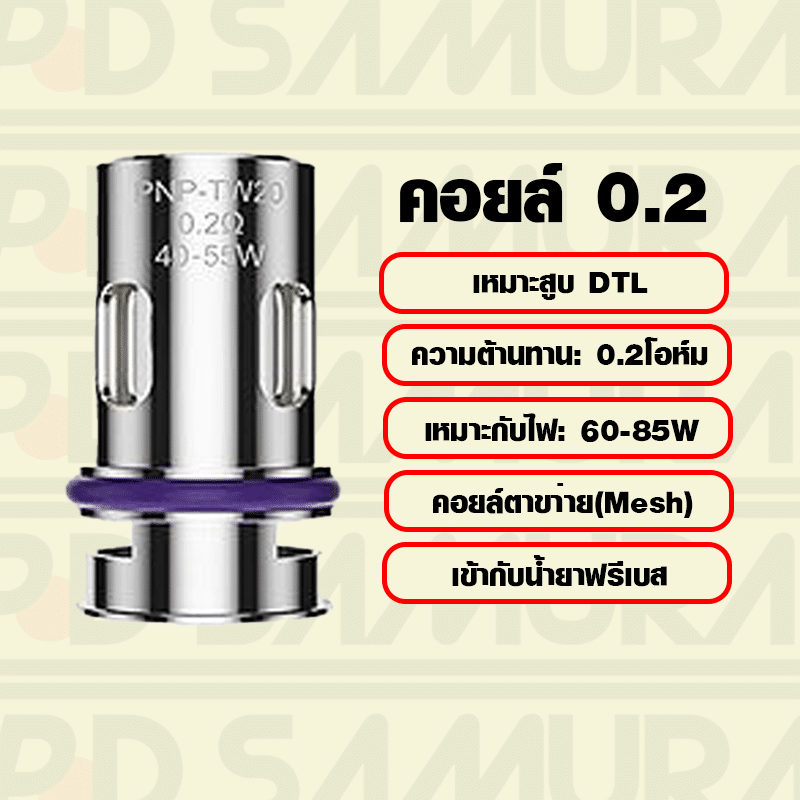 คอยล์(Mesh) 0.2ohm มีการตั้งค่าวัตต์ที่แนะนำที่ดีที่สุดคือ 60-85 วัตต์ วัสดุคอบล์ผลิตจากแคนเทล(kanthal) โลหะผสมเหล็ก โครเมียม อลูมิเนียมที่ใช้ในความต้านทานได้หลากหลายและเหมาะสำหรับใช้งานคอยล์ที่อุณหภูมิสูง