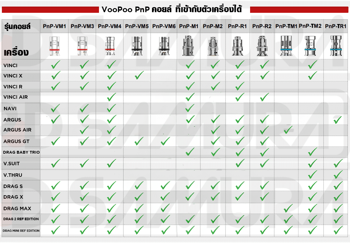 เพื่อให้ง่ายต่อการเลือกซื้อคอยล์เพื่อใช้งานกับเครื่องบุหรี่ไฟฟ้าของคุณ เราจึงได้จัดทำภาพตารางเปรียบเทียบทั้งรุ่นของคอยล์และเครื่องบุหรี่ไฟฟ้าให้ดังนี้