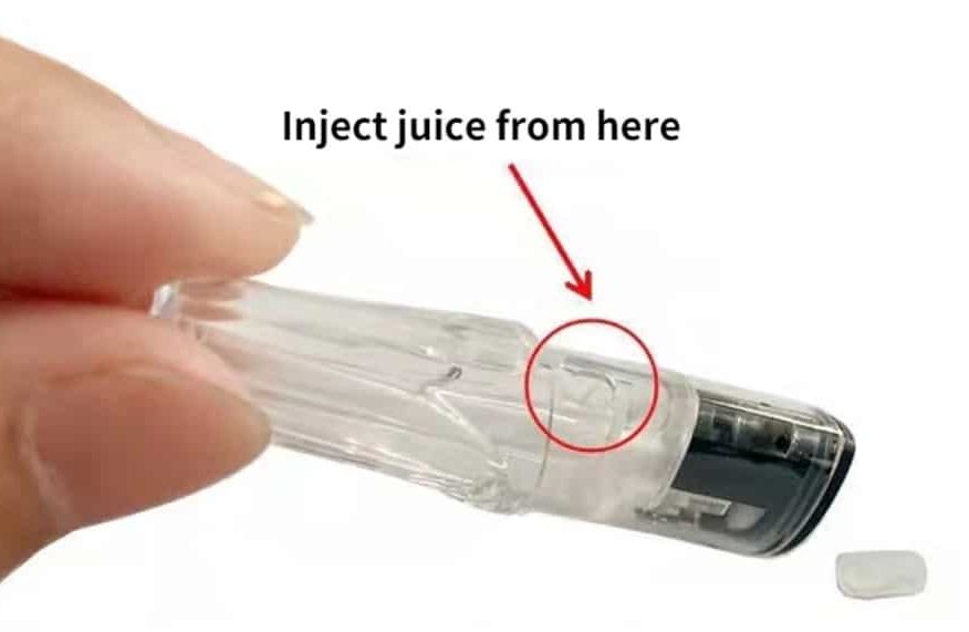 ข้อควรระวัง อย่าลืมหยุดเติมก่อนที่น้ำยาจะไปถึงเส้นเติมที่ทำเครื่องหมายไว้บนช่องเติม ไม่เช่นนั้น น้ำยาบุหรี่ไฟฟ้าที่คุณเติมจะล้นหรือรั่วไหลไปยังส่วนที่เหลือของระบบพอตเปลี่ยนหัว ซึ่งอาจทำให้เครื่องพอตเสียหายถาวรได้