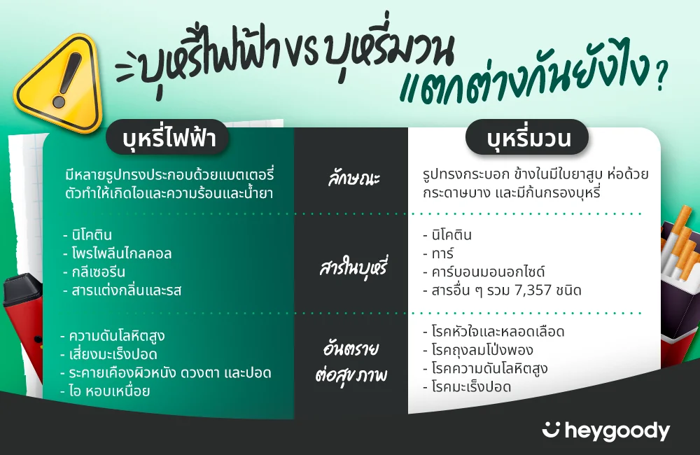 หัวใจสำคัญของความต่างระหว่างบุหรี่ไฟฟ้ากับบุหรี่มวนอยู่ที่วิธีส่งนิโคตินเข้าสู่ร่างกาย บุหรี่มวนทำงานผ่านการเผาไหม้ของใบยาสูบ ซึ่งปล่อยควันพร้อมสารเคมีกว่า 7,000 ชนิด รวมถึงน้ำมันดิน (Tar) และคาร์บอนมอนอกไซด์ ที่เป็นพิษต่อร่างกายโดยตรง ขณะที่บุหรี่ไฟฟ้าทำงานด้วยระบบให้ความร้อนกับน้ำยา(Heat) เพื่อเปลี่ยนเป็นไอระเหย ส่งนิโคตินเข้าสู่ร่างกายโดยไม่ผ่านการเผาไหม้ ผลลัพธ์คือ บุหรี่ไฟฟ้าหลีกเลี่ยงการสร้างควันพิษที่เป็นผลพลอยได้จากไฟจริง แม้จะยังมีสารเคมีในน้ำยา แต่จำนวนสารพิษรวมน้อยกว่าหลายระดับเมื่อเทียบกับควันบุหรี่มวน