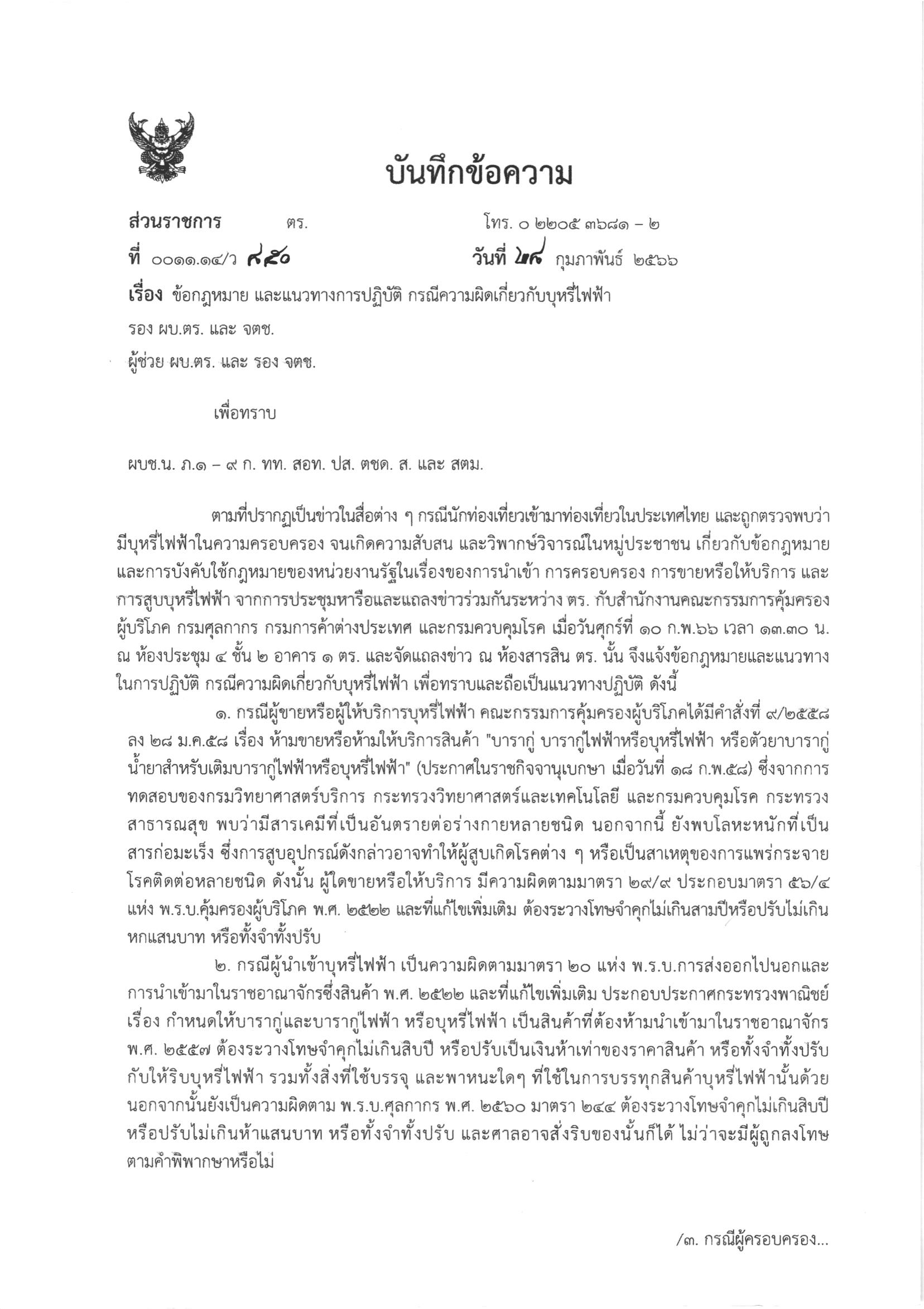อ้างอิงตาม บันทึกข้อความ ที่ 0011.14/ว วันที่ 29 กุมภาพันธ์ 2566 เรื่อง ข้อกฎหมาย และแนวทางการปฎิบัติ กรณีความผิดเกี่ยวกับบุหรี่ไฟฟ้า ลงนามโดย พล.ต.อ. ดำรงศักดิ์ กิตติประภัสร์