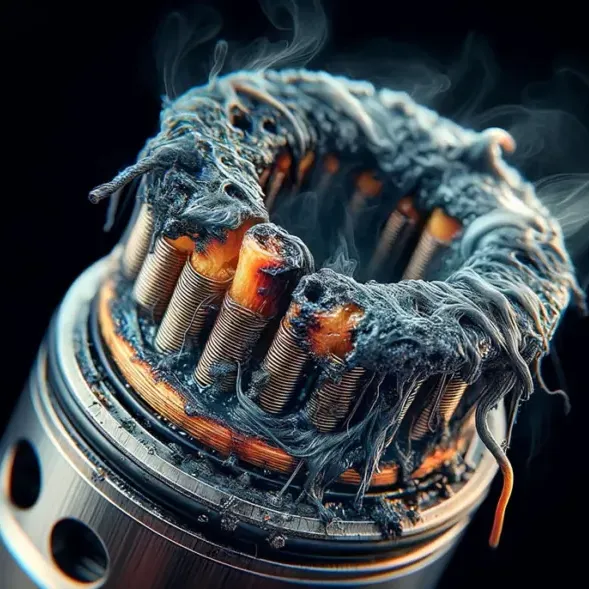 คอยล์เสื่อมสภาพ: เมื่อใช้งานคอยล์มาระยะหนึ่ง สำลีภายในจะเริ่มเสื่อมคุณภาพ ทำให้การดูดซับน้ำยาไม่มีประสิทธิภาพ นำไปสู่การเผาไหม้ที่ไม่สมบูรณ์และเกิดกลิ่นไหม้ โดยทั่วไปควรเปลี่ยนคอยล์ทุก 1-2 สัปดาห์ขึ้นอยู่กับความถี่ในการใช้งาน