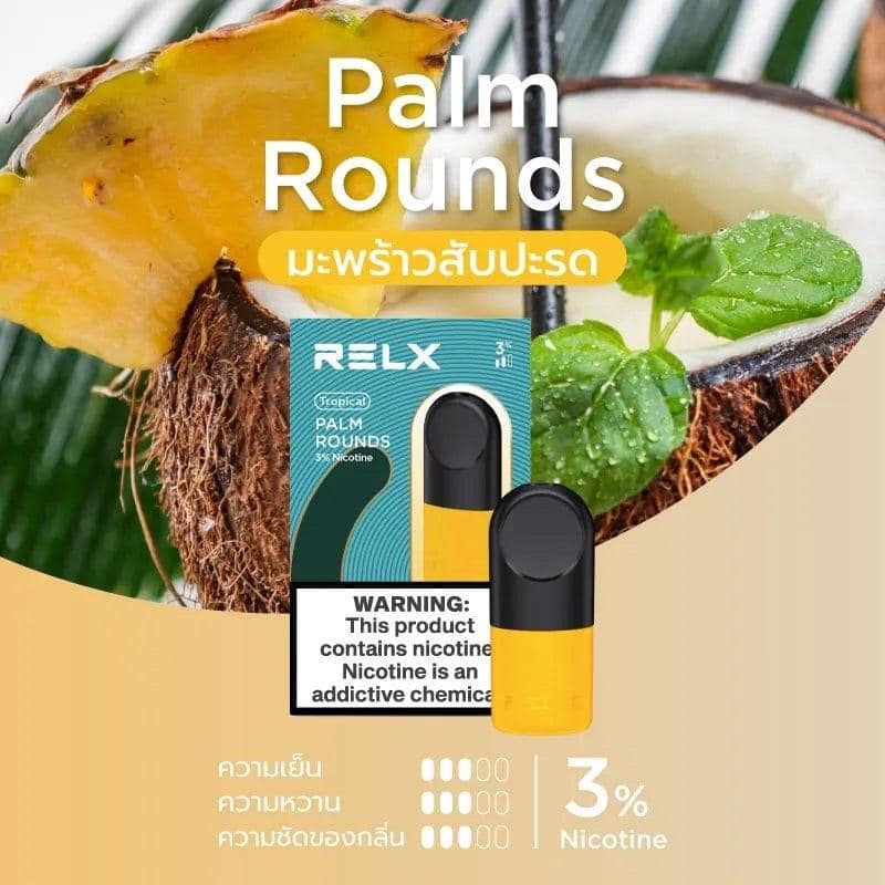 น้ำยาบุหรี่ไฟฟ้า หัวพอตพกพา (POD-SYSTEM) ของ relx infinity ในรสชาติสัมผัสที่เข้มข้นและน่ารับประทานของกลิ่น มะพร้าวสัปปะรด Palm Rounds หัวพอตและน้ำยาบุหรี่ไฟฟ้า Relx ชนิดนี้เป็นสูตรเฉพาะ แนะนำให้ใช้ได้กับพอตรุ่น Relx ต่างๆเช่น Relx Infinity หรือ Relx Essential หรือ Relx Phantom หรือ Relx Lite แต่อย่างไรก็ตาม หัวพอตของ Relx infinity ยังสามารถรองรับการใช้ร่วมกันสำหรับพอตของยี่ห้อ Infy POD และเครื่องพอตของ Jues ได้เช่นกัน ดังนั้น โปรดตรวจสอบให้แน่ใจว่าคุณกำลังใช้พอต POD บุหรี่ไฟฟ้าที่เข้ากันได้ เพื่อรับประกันประสบการณ์การสูบตัวน้ำยาบุหรี่ไฟฟ้าที่ดีที่สุด น้ำยาจากหัวพอต อินฟินี้ตี้ (Relx Infinity POD) มีระดับนิโคติน (nicotine level) คือ 3% โดยเมื่อใช้กับพอตของ Relx, Infy และ Jues จะให้ปริมารณนิคในระดับปานกลาง เหมาะสำหรับผู้ที่ต้องการได้รับนิโคตินในความรู้สึกระดับตื่นตัวโดยทำให้รสชาติ มะพร้าวสัปปะรด ยังคงครบถ้วนและหอมอร่อยอยู่