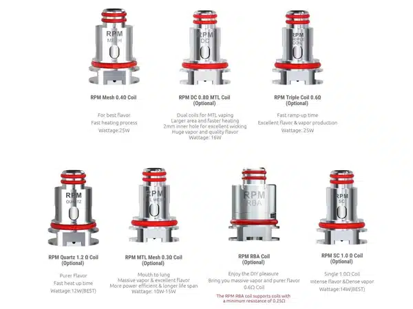 คอยล์บุหรี่ไฟฟ้ารุ่น SMOK RPM40 เป็นชุดคอยล์ที่สร้างขึ้นสำหรับเครื่อง SMOK ที่จ่ายกำลังไฟแก่ 40W พอตสำเร็จ(Pod) รุ่นคอยล์ที่เราแนะนำคือ 0.4ohm RPM ระบบคอยล์ตะข่าย(Mesh Coil) รุ่นใหม่ ใช้การติดตั้งคอยล์แบบเกลียว และเข้ากันได้กับ SMOK Nord รุ่นต่าง ๆ