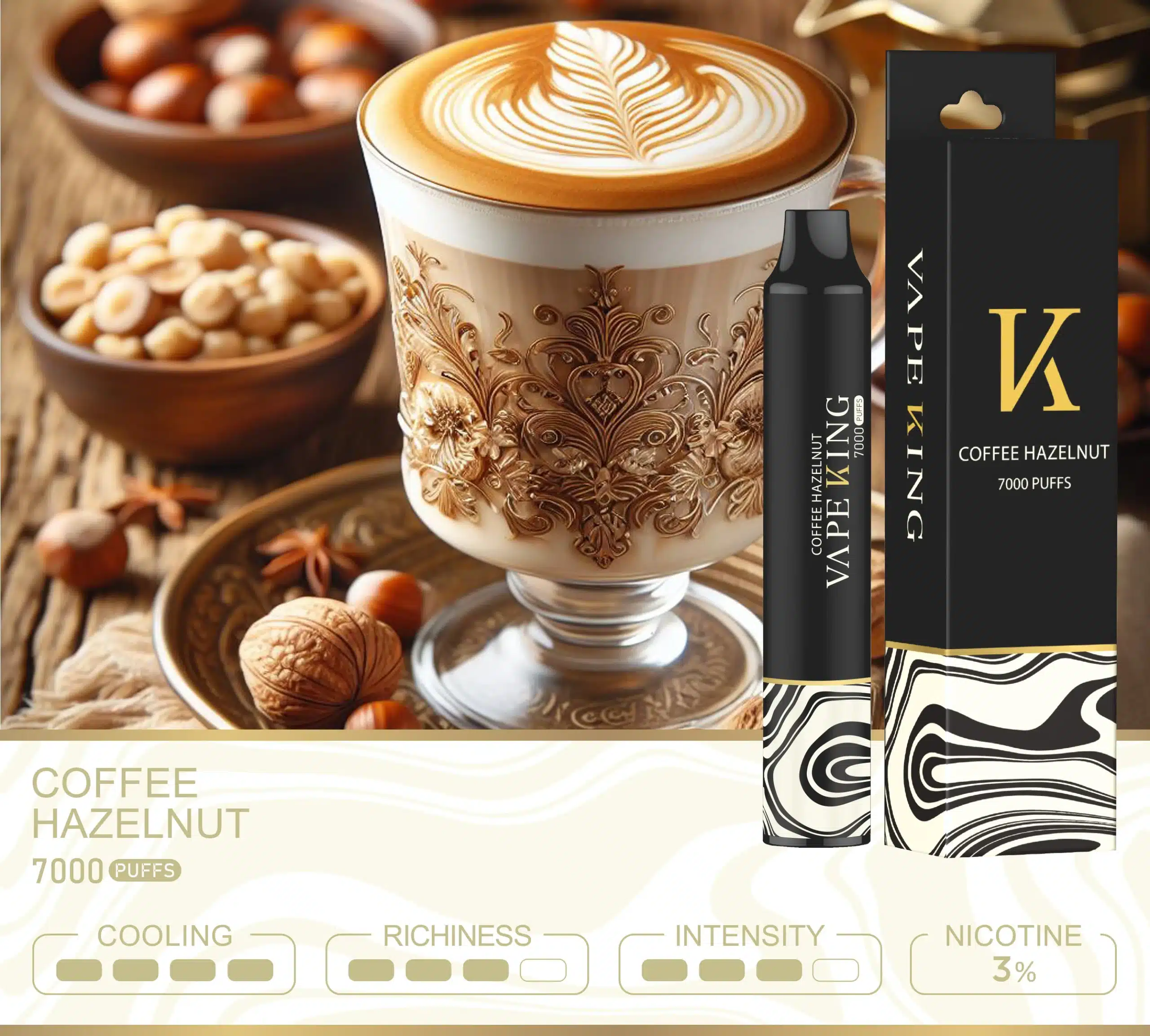 Vape King กลิ่นหอมเข้มข้นและกลิ่นหอมของกาแฟชงสด ผสานกลิ่นหอมเข้มข้นของเมล็ดกาแฟ โดยเป็นพอตใช้แล้วทิ้งที่มาพร้อมนิโคติน 3% (30 มก.) ที่ถูกออกแบบมาในพอตขนาดเล็กกระทัดรัดทรงกระบอกเพื่อรองรับความสะดวกและพร้อมใช้งานทันที กับจำนวนคำที่สูบได้มากถึง 7000 Puffs