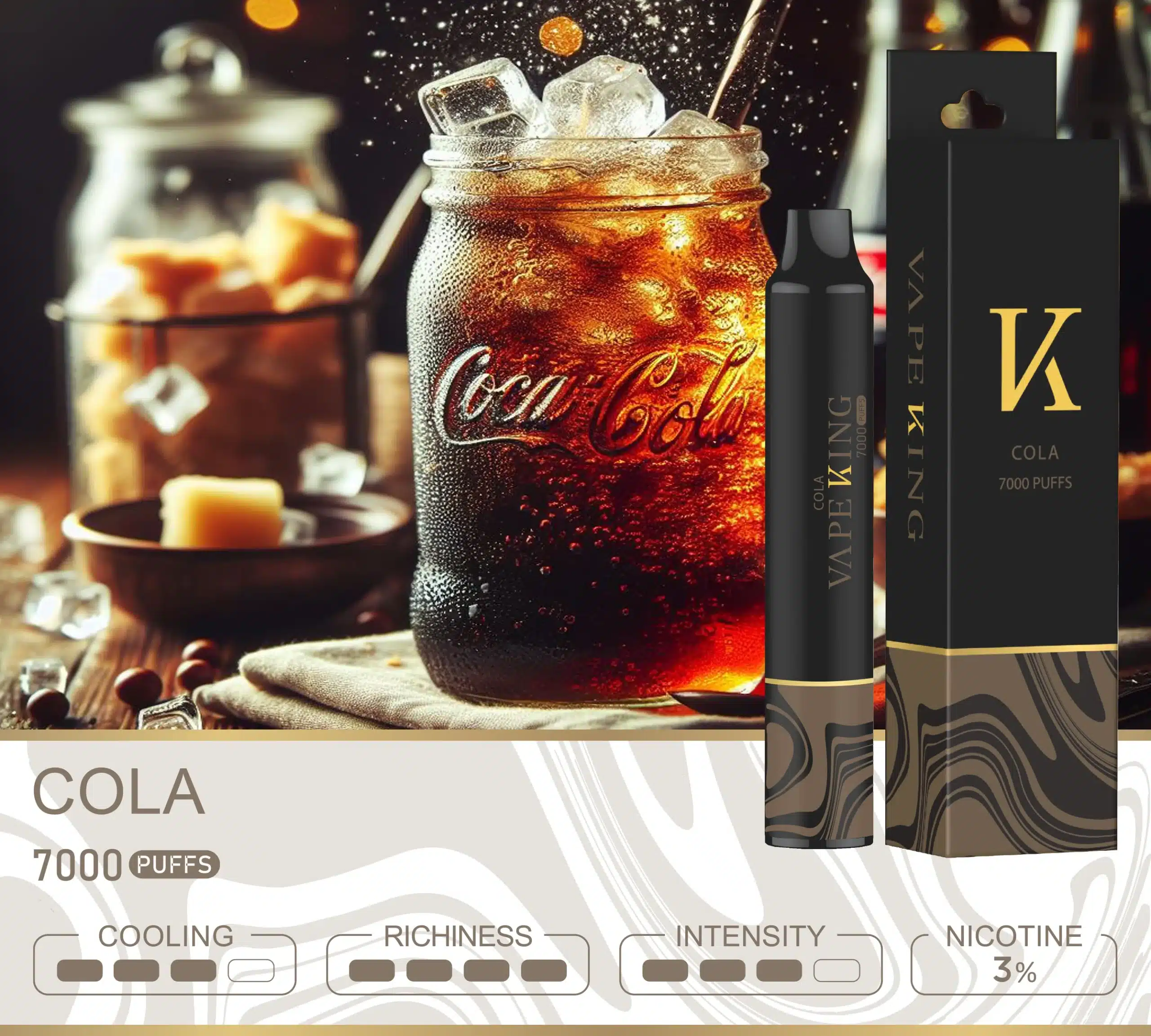 Vape King กลิ่นที่คุ้นเคยของโคล่า ผสมผสานระหว่างความหวานและความเผ็ดอันเป็นเอกลักษณ์ของเครื่องดื่มโคล่า โดยเป็นพอตใช้แล้วทิ้งที่มาพร้อมนิโคติน 3% (30 มก.) ที่ถูกออกแบบมาในพอตขนาดเล็กกระทัดรัดทรงกระบอกเพื่อรองรับความสะดวกและพร้อมใช้งานทันที กับจำนวนคำที่สูบได้มากถึง 7000 Puffs